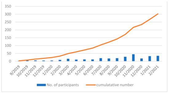 During the study period, 19 conferences were held and 302 participants participated in the conferences. The average number of participants was 16.8 (standard deviation (SD) = 11.9) (Figure 1). Each conference was facilitated by the organizers, and the average number of organizers in each conference was 5.3 (SD = 0.89). All the conferences were held as per schedule, and three Osekkai topics were discussed among the participants.