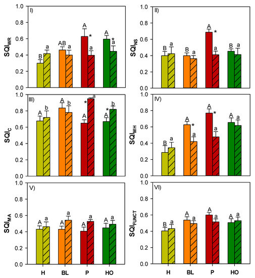 2.5.2. SQI Calculated for Water Retention (SQIWR), Nutrient Supply (SQINS), Contamination (SQIC), Microorganism Habitat (SQIMH) and Microorganism Activity (SQIMA) Functions