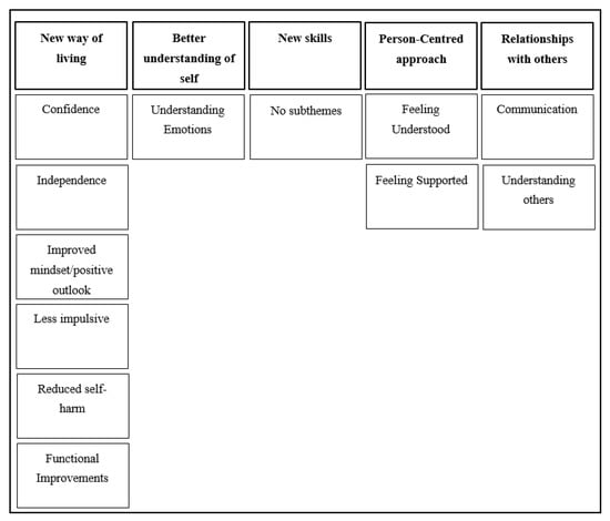 New skills (Figure 1) were reported to have helped with understanding different emotions and improving quality of life and relationships. Participants also highlighted the approach of DBT as being more solution focused, which has equipped them with applicable skills to help when distressed.