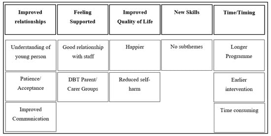 Parents and carers found that they had improved relationships with both their young person and their partners and attributed this to subthemes of gaining a better understanding of the young person, patience/acceptance, and improved communication. Another theme that emerged was feeling supported during their young person’s time with the DBT service as a result of the good relationship with staff and participating in the DBT parent/carer groups. Parents and carers reported a major theme of improved quality of life and described being happier and observing reduced self-harm in their young person. The improvements that parents and carers suggested for the DBT service were related to the theme of time/timing with subthemes of a longer programme and earlier intervention suggested as being more beneficial, and the subtheme of the time-consuming nature of the programme posing difficulties for single and working parents.