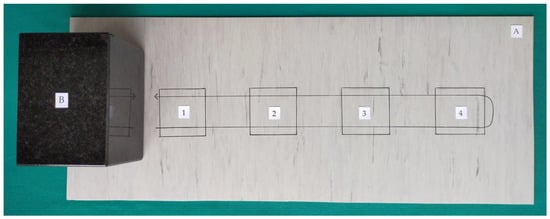 Model of the markings the four test fields on the test surface. (A) Test surface; (B) Unitary weight, 1–4: Test fields 25 cm2, 1: Inoculated field.