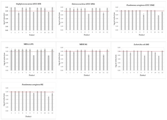 Bactericidal activity of disinfectant products against bacterial strains after the contact time declared by the manufacturers. Products 1–12—see Table 1; The results above the horizontal line (log 5) indicate results complying the EN 16615. Mean and SD values are presented.