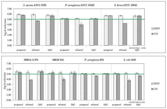 Comparison of bactericidal activity of self-made wipes (SMW) and commercial wipes (CW) soaked in three disinfectants for standard and clinical isolates. The results above the horizontal line (log 5) indicate results complying the EN 16615. Propanol: self-made wipes no. 2, commercial wipes no. 8; ethanol: self-made wipes no. 1, commercial wipes no. 7; QACs—quaternary ammonium compounds: self-made wipes no. 4, commercial wipes no. 10. Mean and SD values are presented.