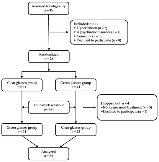 All study participants received an explanation of the purpose of the study during the preoperative consultation. The patients underwent two color exposures with glasses (Color Therapy Glasses, GloFX, FL, USA) on two different days: wear of green-colored glasses or clear-color glasses (as control). Using a computer-generated randomization method, the participants were randomly allocated to PIC with green color exposure (green group) or clear color exposure (clear group) first, and then crossed over to the other type of glasses after a 4-week washout period. It was not possible to blind the participants to group allocation. Therefore, to minimize bias and expectations, the patients were not told which color affected stress, anxiety, and pain during PIC.
