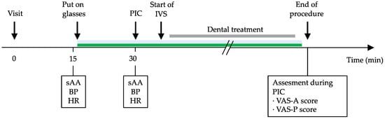 The patients were not allowed to drink for 3 h or eat for 6 h before treatment to avoid vomiting during IV sedation. After 15 min of rest in a waiting room, baseline values for salivary amylase activity (sAA) and vital signs, including systolic blood pressure (SBP), diastolic blood pressure (DBP), mean blood pressure (MBP), and heart rate (HR), were measured. The patients then put on their trial glasses and stayed in the waiting room for 15 min, after which they entered the treatment room and were seated in the dental chair. The patients in both groups were treated by a clinician with at least 5 years of experience performing PIC. While the patient’s blood pressure (BP) and HR were monitored, IV cannulation was performed with a 22- or 24-gauge catheter via a vein on the dorsum of the hand. The sAA level and vital signs were then measured and recorded during PIC. Dental treatment was started when sedation was confirmed. After the procedure, when the patients had recovered from sedation, they rated their feelings during PIC using the VAS-A and VAS-P (Figure 2).