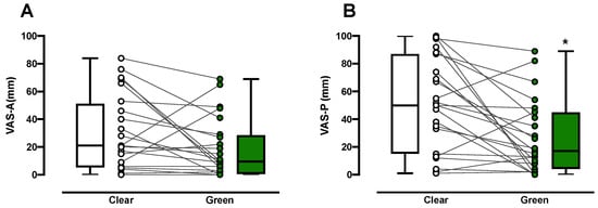 The intensity of anxiety during PIC was less with green color exposure than with clear color exposure in 18/23 subjects, although it was not significant (median VAS-A, 9.5 versus 21.0; p = 0.109, Mann–Whitney U-test, Figure 3A). Similarly, the intensity of pain during PIC was significantly less in the green group than in the control group in 19/24 subjects (median VAS-P, 17.0 versus 50.0; p = 0.011, Mann–Whitney U-test, Figure 3B).