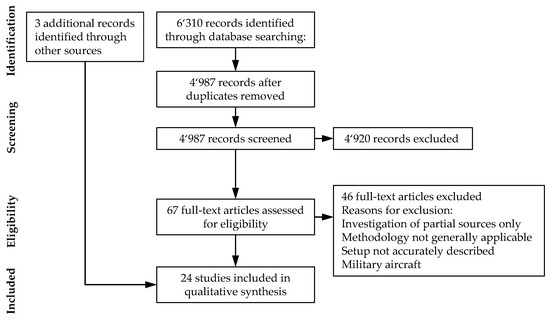 In the full-text screening of the remaining 67 records, 46 references turned out to be irrelevant, either because only certain aspects but not the drone as an overall system were examined, the measurement set-up was not generalizable or not specified in enough detail, or military flying objects were described. This left 21 relevant articles.