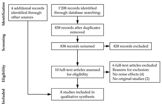 For the literature review on noise effects, we adapted the published study protocol PROSPERO 2013 CRD42013006004 by Seidler, et al. [10] to our review purpose, which had been used, e.g., by Weihofen, et al. [11] and Hegewald, et al. [12]. This protocol was considered a suitable starting point, as it had been used for a systematic review on the related topic “Systematic review: environmental aircraft noise and non-auditory health complaints and diseases” [10].