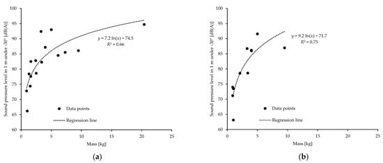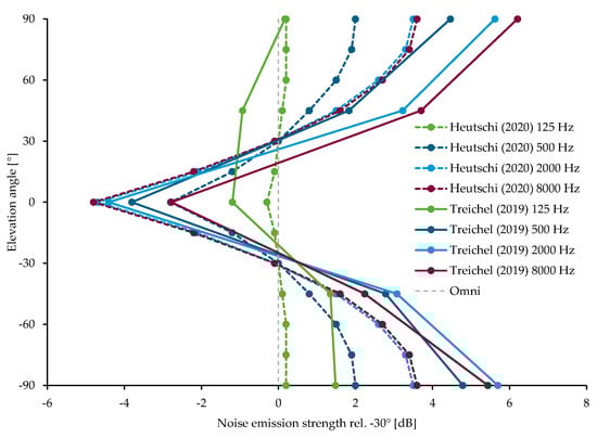 A total of 24 studies were included in the systematic review on noise emissions of drones (Figure 1). Table 2 lists the studies and reports the considered types of drones, the flight maneuvers, the microphone arrangements, and the reported noise emission data. Note that the analyses refer exclusively to studies of pure multicopters. Fixed-wing aircraft or mixed forms are not addressed. Below, the measurement methods used are first discussed (Section 4.1) and usable emission values are identified and converted into comparable characteristic values (Section 4.2). Thereafter, the vertical source directivity (Section 4.3) and special sound characteristics of drones are contemplated (Section 4.4).
