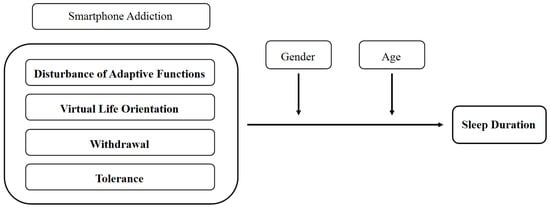 The research model was designed to examine the moderating effects of gender and age in the relationship between smartphone addiction and sleep duration in children and adolescents (Figure 1). The sub-factors of smartphone addiction—disturbance of adaptive functions, virtual life orientation, withdrawal, and tolerance—and their effects on sleep duration [17] were put forward in this study.