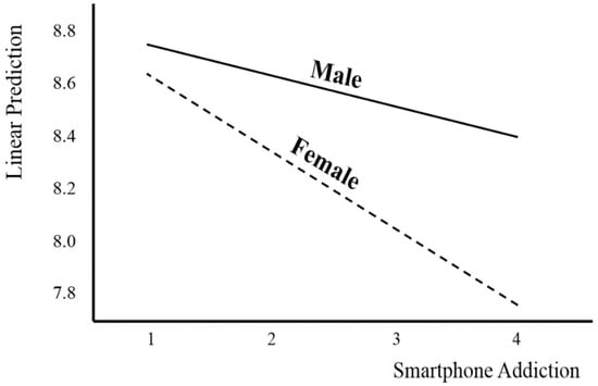 The effect of using gender as a moderating variable in the relationship between smartphone addiction and sleep duration is shown in Figure 2. It shows that the higher the level of smartphone addiction, the more rapidly the sleep duration for females decreased compared with males.
