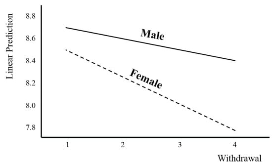 The moderator effect of gender in the relationship between withdrawal and sleep duration is shown in Figure 3. It shows that the higher the degree of withdrawal was, the more rapidly the sleep duration decreased in females (Figure 3).