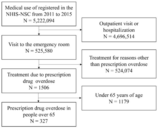 Through the literature review, the risk factors of prescription drug overdose in older adults were identified to be concurrent chronic medical disease, polypharmacy, concurrent psychiatric illness, female sex, old-old age, social isolation, physical disabilities/reduced mobility, chronic pain, history of alcohol problems, and transitions in care/living situations [20,21,22,23,24]. Chronic medical diseases included heart disease, chronic lung disease, diabetes, chronic kidney disease, and cerebrovascular disease. Musculoskeletal disease was classified into the category of physical disabilities/reduced mobility, and psychiatric disorders, including Alzheimer’s disease, were classified separately.
