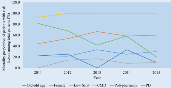 Trend of mortality proportion in overdosed patients with risk factors. SES, socioeconomic status; CMD, chronic medical disease; PD, psychiatric disease.