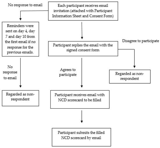An invitation was sent via e-mail to each potential expert asking for her/his participation. A total of a maximum two-week period was given to obtain their response. Reminders were sent to those who had not responded by day 4, 7 and 10 from the first email. The respondent had the right to refuse or withdraw from the study at any point of time during the survey. Respondent refusal or withdrawal from the survey did not affect them in any way. Once written informed consent had been received by email, the survey form was given via e-mail to the respondents. Respondents were asked to complete the questionnaire within four weeks from their consent date. Please refer to the data collection flow chart (Figure 1) for more details.
