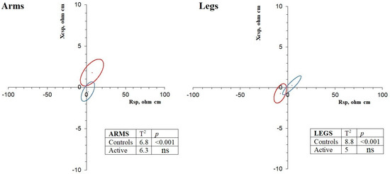 Differences between the limbs of the two sides (dominant vs. non-dominant arm, and right vs. left leg) were analyzed using paired Student’s t test, considering Cohen’s d effect size and Hotelling’s T2 test, and were graphically represented in the paired data RXc graphs. In these graphs, ellipses overlapping the origin indicated no differences between the bioelectrical values of the two sides. By contrast, non-centered ellipses indicated significant differences between sides, with the effect of R or Xc prevailing when the ellipse approached the corresponding axis. The level of asymmetry was compared between limbs, age subgroups (<60 and ≥60 years), and modalities by means of the Hotelling’s T2 test.
