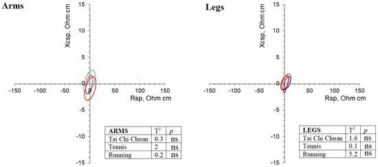 Active participants showed limb symmetry, as indicated by the paired Hotelling’s T2 test and the overlap of the ellipses with the origin of the graph (Figure 1), and as confirmed by the paired Student’s t test, which showed no differences between the bioelectrical values of the two sides (Table 2). The only exceptions were the univariate comparisons of Rsp and Zsp (Table 2), which indicated a slightly higher %FM in the right leg. The symmetrical pattern was similar between the limbs and between age subgroups (<60 and ≥60 years). The symmetrical body composition among athletes was also observed considering the different disciplines separately. The paired confidence ellipses of the Tai Chi Chuan, tennis, and running groups were all centered on the origin of the graph, and the bivariate comparison between sides was always not significant (Figure 2), as well as the comparison of asymmetry levels among disciplines. The univariate comparisons also indicated the lack of significant differences between sides for the arms in all of the groups, with the exception of a tendency to higher Rsp values (higher %FM) in the right legs of runners (p = 0.034).
