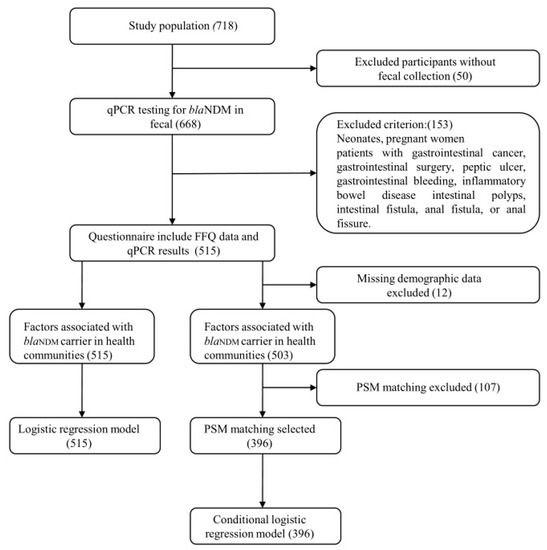 The characteristics were expressed as the mean and percentages for continuous and categorical variables, respectively. Baseline demographic and laboratorial characteristics were presented as mean ± standard deviation (SD) or a number with percentage. The differences between the groups were examined by the Student’s t-test, or Chi-square test, depending on data types. Logistic regression models were conducted to assess the odds ratio (OR) and 95% confidence interval (95% CI) for each dietary factor on blaNDM carrier. Specifically, an association model was developed to study the dietary intake that best predicts blaNDM carrier. First, all categorized food groups were univariately tested in the model with absence or presence of blaNDM gene as an outcome. All categorized food groups with p < 0.2 were included in the association model, which also included the previously described potential confounders: sex, age, number of previously prescribed antimicrobial drugs (penicillin, floxacin, polymyxin and metronidazole), diabetes, triglycerideindex, body mass index (BMI). Next, backward selection with p < 0.2 as end point (only for the food groups) was conducted to determine the final model. Spearman’s correlation coefficients for the food groups were calculated. To prevent collinearity, food groups with a correlation >0.7 were not added to the same model. The variance inflation factor (VIF) was calculated to evaluate the multicollinearity of multiple models. A VIF < 10 indicates that the multicollinearity may not affect the estimations [21]. The Hosmere-Lemeshow test was performed to test the goodness-of-fit of the model. Propensity score matching (PSM) was performed using psmatch2 (Figure 1). All statistical analyses were performed with IBM SPSS Statistics 24.0 (SPSS Inc., Chicago, IL, USA), STATA 12.0 (StataCorp, Texas City, TX, USA) and R 3.3.3 (Lucent Technologies, Murray Hill, NJ, USA). p < 0.05 was considered statistically significant.
