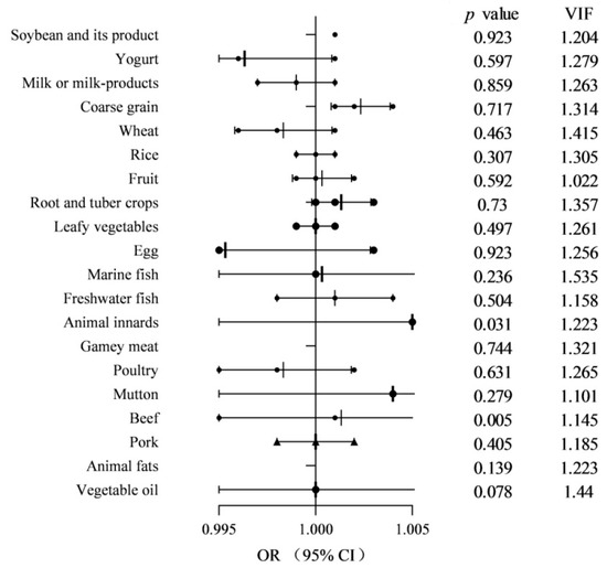 The multiple FFQ model for the associations of FFQ with the risk of blaNDM carrier.OR, odds ratio; VIF, variance inflation factor; 95% CI, 95%confidence interval. The dotsrepresent crude oddsratios, and the horizon lines represent 95% confidence intervals. p-valueswere obtained from the univariate logistic regression models by using the FFQ as a continuous variable.