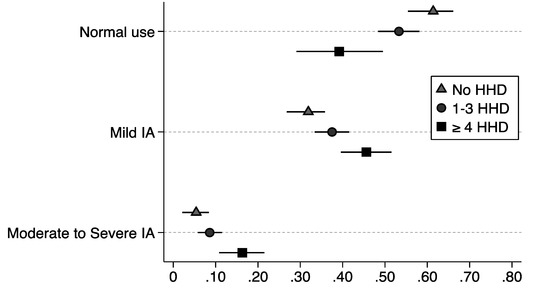 An ordinal logistic regression model assessed the association between HHD and mild, and moderate to severe IA adjusting for age, sex, race/ethnicity, financial hardship due to COVID-19, depression, and social support from friends. A second model included an interaction term (HHD*peer social support) and tested whether peer support buffered the association between HHD and mild and moderate to severe levels of IA. To understand the association between HHD and each level of IA (normal use, mild addiction, and moderate to severe addiction), the delta method was used to calculate the probability of normal use, mild IA, and moderate to severe IA for HHD categories (none, 1-3 HHD, and ≥4 HHD). All analyses were conducted using STATA v. 15 [97].
