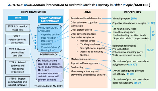 The AMICOPE intervention is addressed to older people living in the community and aims to improve and/or maintain IC by promoting physical activity, healthy nutrition, and psychological well-being. A multimodal exercise program tailored to individual capacities and needs has been suggested as the most important approach to improving or maintaining locomotor capacity [11,20,21,22,23,24,25,26,27,28,29,30,31,32,33,34,35]. The significant contribution of nutrition to frailty has also been underlined by some authors [38,40]. However, other researchers have suggested that nutritional interventions delivered alone may not be effective for the management of frailty in older people [66]. As for the psychological domain, previous studies showed that group-based interventions addressing loneliness and social isolation could help to reduce depressive symptoms [45,62]. During the development process, specific and brief contents about cognitive stimulation and medication review were finally incorporated as part of the intervention, though it was beyond the initial aims of the intervention. This decision was taken on the basis that preventive cognitive training has benefits for older people, as reported by researchers [67]. A medication review can reduce polypharmacy by eliminating unnecessary, ineffective medications and those with a duplicative effect [68]. Nevertheless, scientific literature has evidenced that most factors related to losses in intrinsic capacity share the same underpinning physiological and behavioral causes [11]. Hence, interventions have benefits across different domains of IC. Physical exercise prevents loss of mobility but also has indirect preventive effects against psychological distress and cognitive decline [20]. Nutrition reinforces the effects of exercise [38,39,40]. Loneliness increases the risk of malnutrition [69]. Finally, we included goal setting as a cross-sectional element in our intervention, which has been considered by some authors as an effective behavior change technique as well as a fundamental component of successful interventions [70], including those promoting good dietary habits and physical activity [71] and, particularly, when integrated in complex interventions addressed to older people [72].