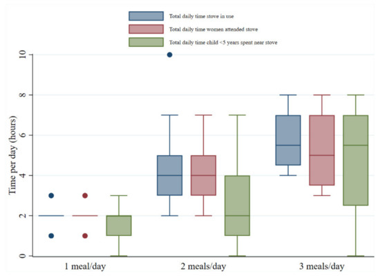 Of 35 women who provided information about cooking times, just over half (51%) cooked one meal per day, most commonly in the morning between 10 a.m. and 12 noon. These women commented that they cooked a large quantity of food at once so that there was enough to eat later in the day. Women cooking two (37%) or three (11%) meals per day also frequently reported cooking between 10 a.m. and 12 noon and 6 p.m. and 8 p.m. The total time women spent attending their cookstove each day ranged from a minimum of 1 h to a maximum of 8 h (median = 3 h), meaning that some women were spending up to one third of every 24 h period near their stove (within 2 m). Women who cooked more meals each day spent longer on average near their stoves, as did their children (Figure 3), with the accompanying exposure to cooking smoke. Women cooking one meal per day spent on average (median) 2 h near their stove whilst women cooking three meals per day spent 5 h on average. For each ‘meal group’, the time the child spent near the stove was less than the women.