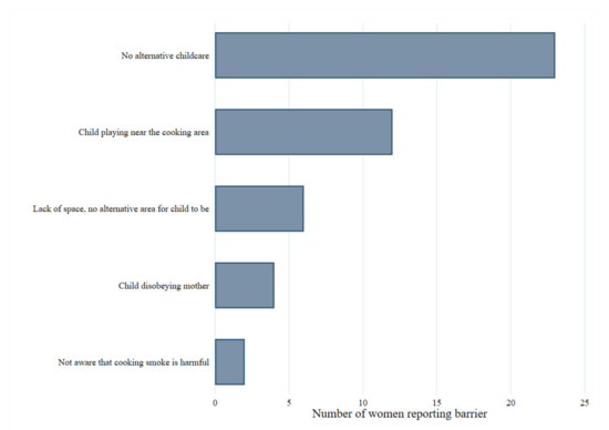 Over half of participants (53%) were unaware that the smoke from charcoal cookstoves could cause health problems for themselves and other household members. Furthermore, the majority of women (86%) allowed their children near the cookstove (within 2 m). Participants identified several barriers to preventing their child’s close exposure to the stove and hence cooking smoke, which are illustrated in Figure 4. The most common reason cited was the lack of alternative childcare, meaning that the child must accompany them during cooking sessions at the stove. Four of the five households where children were not allowed near the stove reported this was because they feared their child being burnt.