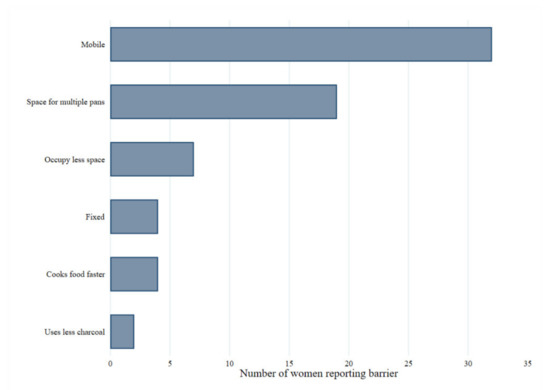 Overall, one quarter of participants regularly cooked in a separate kitchen area, normally a small building or room either attached or detached from the house. Past studies have used this as a proxy for wealth, which is reflected in the association between increased household wealth and increased likelihood of adopting ICS interventions [25,26]. Socioeconomic factors were also presented as barriers to the adoption of air quality interventions, with 33% not owning their property and 14% reporting a lack of household space. Participants also identified negative factors concerning current cooking practices, including traditional charcoal cookstoves being easily broken (20%) and dirty to cook with (17%), in addition to the health risks including burns and injuries (45%). The improved understanding of local contextual factors identified in this survey is highly valuable for formative development of an effective public health intervention in this local context [27].