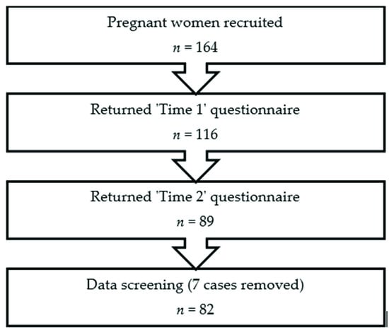 Of the 164 pregnant women who consented to participate, 116 returned their “time 1” questionnaires and 89 completed the study. The average time between the completion of “time 1” and “time 2” questionnaires was three weeks (20.9 days). Non-responders at both “time 1” and “time 2” were sent three reminders before being excluded from the study. Following initial screening of data, seven cases were removed from the study: two sets of questionnaires had missing or incomplete data, three participants completed the questionnaire incorrectly, one data set displayed ‘response set’ answers, and one participant revealed that she was expecting twins and, therefore, did not meet the inclusion criteria (see Figure 1).