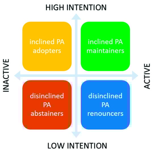 Intention (or an individual’s stated orientation towards behaviour) represents the motivational factors of (1) attitude (a construct based on behavioural beliefs around the likely consequences of engaging in a specific behaviour); (2) subjective norm (a construct based on normative beliefs representing the perceived pressure to conform to the perceptions of significant others regarding a specific behaviour); and (3) PBC (a construct based on control beliefs signifying the perceived ability with which one can carry out a specific behaviour); [,]. Whilst McEachan et al. [] suggest that past behaviour tendencies are not as easily changed as these motivational factors and that such findings are of concern when devising behavioural interventions, the outcome of this current study presents healthcare professionals and researchers with an opportunity to introduce tailored advice and interventions based on the profiling of pregnant women. Specifically, four profile types are being proposed to match intention and behaviour status (see Figure 2): (1) women who have been regularly active in the past and intend to continue being physically active throughout their pregnancy, i.e., inclined PA maintainers; (2) pregnant women who have been active in the past and do not intend to maintain their PA routine, i.e., disinclined PA renouncers; (3) women who have been inactive but intend to be physically active during their pregnancy, i.e., inclined PA adopters; and (4) pregnant women who have been inactive in the past and do not intend to be physically active during their pregnancy, i.e., disinclined PA abstainers. Future research should explore these proposed scenarios and investigate which techniques and strategies may be best-suited to each. For example, strategies such as very brief advice [] may be more suited to inclined PA maintainers; a person-centered approach involving goal setting may be required to re-engage disinclined PA renouncers; motivational interviewing (MI) could be utilised to support inclined PA adopters, whereas a PA counselling approach (incorporating behaviour change and MI techniques) may be required to engage disinclined PA abstainers.