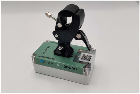 The housing is mounted onto the handlebar of the bicycle (see Figure 2). The housing contains the sensors, the battery and the communication unit. The communication is facilitated via Long Term Evolution (4G), category M1 (LTE-M), which is a wireless communication standard which belongs to the category of low-power wide-area networks (LPWAN), enabling to connect devices that need small amounts of data, low bandwidth, and long battery life. The IMEI-number is the unique identification of the sensor kit, used throughout the whole process. Being on a mobile platform, the power of the sensors is provided by batteries that have to be charged before the trips. In theory, a charged set of batteries should allow for up to 8 h of measurements, more than enough for daily use. In practice, this was an upper limit and not all users kept the batteries sufficiently charged. A guide on how to build your own “Sniffer bike” sensor kit (of the initial pilot tests) is shown on the website of the manufacturer [28].