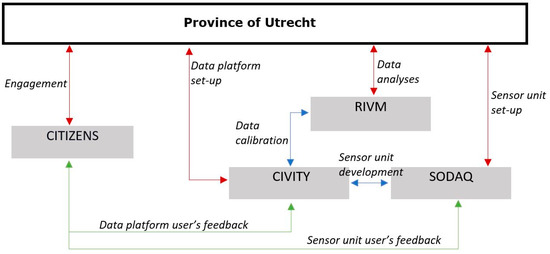 - Wesseling, J.; de Ruiter, H.; Blokhuis, C.; Drukker, D.; Weijers, E.; Volten, H.; Vonk, J.; Gast, L.; Voogt, M.; Zandveld, P.; et al. Development and Implementation of a Platform for Public Information on Air Quality, Sensor Measurements, and Citizen Science. Atmosphere 2019, 10, 445. [Google Scholar] [CrossRef]