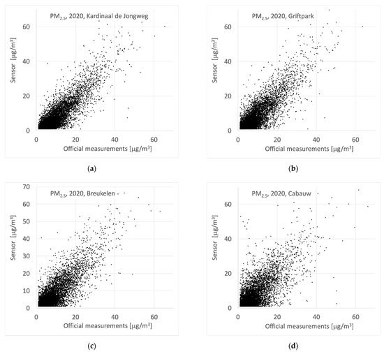 After the cleanup and filtering, the sensor data were calibrated. Calibration is needed because concentrations reported by low-cost sensors are affected by several factors, such as meteorological circumstances (e.g., humidity). For this calibration, we relied on data from co-located sensors at three official reference stations in the province of Utrecht. A fourth official location was close enough to co-located sensors to also participate in de measurements. As a first check, we compared the official hourly PM2.5 measurements with the average values of all sensors passing by that location (within 1 km) and with sensors co-located at that station (Figure 5).