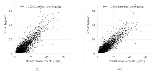 To test the calibration algorithm, we calculated hourly correction factors for the sensors without using the official data at location “Kardinaal de Jongweg” and then applied this factor to the sensor located at “Kardinaal de Jongweg” (Leave Station Out, LSO). The results are shown in Figure 6. The underestimation of the concentration at lower concentration levels and higher relative humidity’s was substantially reduced. Overall, the correlation looks better, although it only slightly improves from 0.86 to 0.87.