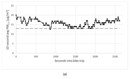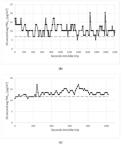 Several typical time series of measurements during bike trips. Concentrations in μg/m3 are plotted as a function of the seconds passed since the start of the trip. The dotted lines indicate the level of the assumed background concentration. (a) Measured concentrations during a bike trip on 21 January 2020; (b) measured concentrations during a bike trip on 23 May 2020; (c) measured concentrations during a bike trip on 10 August 2020.