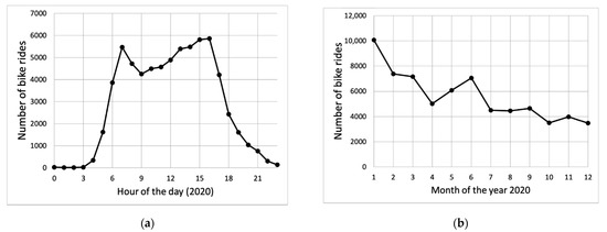 (a) The number of bicycle trips with valid data for the present analysis in 2020 as a function of the hour of the day and (b) the number of bicycle trips with valid data as a function of the month of 2020.