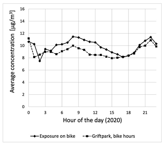 The average PM2.5 concentrations during bicycle trips in 2020 as a function of the hour of the day. The average PM2.5 concentrations at the urban background location “Griftpark” are also shown for comparison.