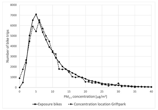 The estimated exposure to (total) PM2.5 concentrations during the bike trips is presented in Figure 10. The figure also shows the distribution of PM2.5 concentrations at the urban background location in the city of Utrecht. The distributions are quite similar, and both show the familiar lognormal shape.