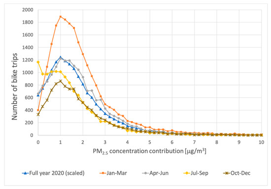The shapes of the distributions shown in Figure 12 are quite similar. When they are all scaled to the same number of bike trips, only the distribution for the July–September stands out with more bike trips having lower estimated PM2.5 contributions due to road traffic. The dispersion of emissions on the road differs in winter and summer, leading to different traffic-related concentrations. Furthermore, with 7.2 μg/m3, the average PM2.5 concentrations in the province in the summer period (July–September) are almost 2 μg/m3 lower than the average in the other months. As a result of the dispersion and absolute concentration levels, the fluctuations of the PM2.5 concentrations become very small, probably in the order of the random uncertainty of the sensor measurements. The average estimated PM2.5 contributions due to road traffic for the four periods are 2.0 (January–March), 2.0 (April–June), 1.7 (July–September), and 2.1 μg/m3 (October–December).