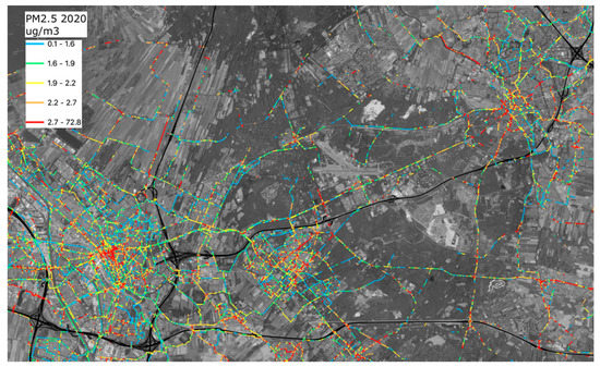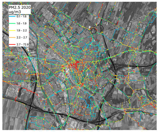Figure 13 and Figure 14 show the estimated exposure to emissions of surrounding road traffic for parts of the area studied. For every location during a bike trip with a measurement, the estimated traffic-related exposure at that location during that trip is calculated. All these values are stored in a 25 × 25 m2 grid covering the whole province of Utrecht. At the end of the analysis, the average traffic-related exposure is calculated for all grid cells and the average exposure is assigned to road segments intersecting those cells. Only road segments in grid cells—in which at least 15 times bikes reported estimated concentration contributions due to traffic—are shown (data must be provided by at least three different bikes). The highways, where cycling is not allowed, are marked in black.