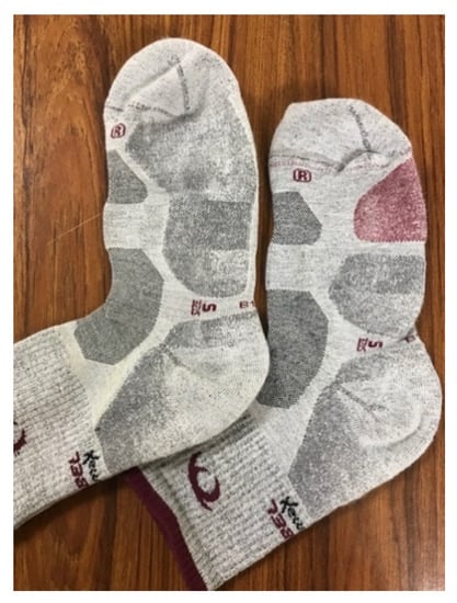 - Pico, A.M.P.; Álvarez, E.M.; Quintana, R.M.; Acevedo, R.M. Importance of sock type in the development of foot lesions on low-difficulty, short hikes. Int. J. Environ. Res. Public Health 2019, 16, 1871. [Google Scholar] [CrossRef] [PubMed]