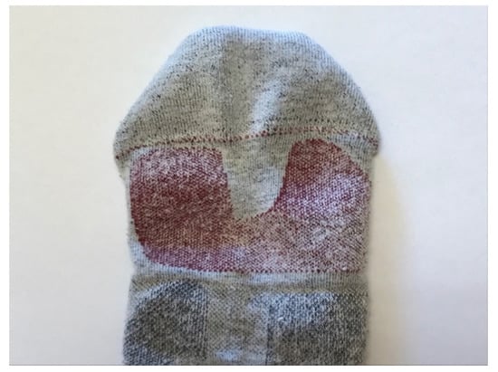 Socks with metatarsal cushioning could be very useful for trekking activities and for long, multi-stage walks in which foot lesions are frequent. Chicharro et al. [2] found that up to 74% of walkers doing the Camino de Santiago (Saint James Way) pilgrimage presented with blistering lesions after completing some of the stages, which could lead to their abandoning of the activity due to the intense pain. Furthermore, one of the most frequent zones (18.3%) where these blisters appeared was that of the second and third MTH. In this sense, a U-shaped cushion is the usual choice to apply for the central MTH [12], and it seems to be more effective in reducing plantar pressure than the C-shape [38]. In addition, this U-shape, being open at the front of the sock, prevents the formation of window oedema [39], which can be a complication of doughnut-shaped cushioning [40].