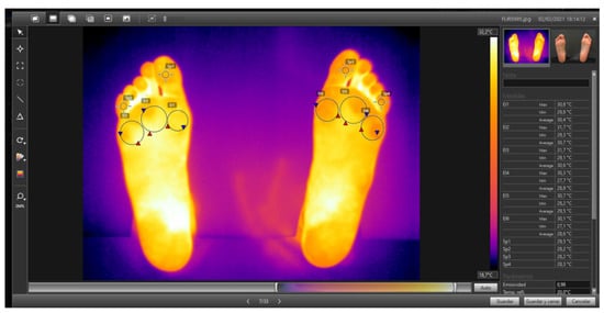 Thermography is used in medicine in several research fields, such as allergology, dermatology, physical therapy, and dentistry, as well as in a wide range of sports, to assess the physiological responses of the skin under different conditions, which can lead to the discovery of vascular diseases or aid the in the screening of breast cancer [18]. The analysis of the temperature of the foot’s plantar surface is an indirect way to evaluate plantar load, which has shown a good capacity to predict the vertical, triaxial, and shear components of those loads [19,20]. In this way, analysis with infrared thermography could capture the temperature differences between the regions of interest in the foot, and identify the zones with greater biomechanical participation while walking (as hotter zones), and therefore those that support a greater load. With this technology, it has been possible to determine that, both before and after a race, the highest temperature in the forefoot zone corresponds to the central region [21].