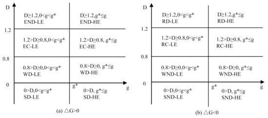 The divisions of decoupling status of the two-dimensional decoupling model. (a) ΔG > 0, (b) ΔG < 0 (g* means the threshold value of per capita GDP).