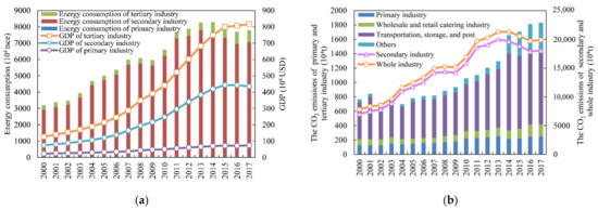 The changes of energy consumption and GDP in three different industries (a), and the CO2 emissions of each industry in Gansu from 2000 to 2017 (b).