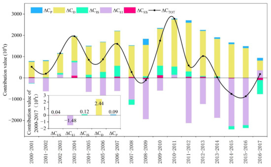 Additive decomposition results of Gansu’s CO2 emissions changes from 2000 to 2017 and the entire period. Here, means the total CO2 emissions changes over time; , , , , and indicate the CO2 emissions changes caused by population, economic output, industrial structure, energy intensity, and energy structure, respectively.