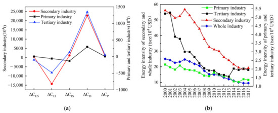 The cumulative contribution values of energy intensity in the three different industries were −58.04 × 104 t, −14,267.78 × 104 t, and −483.21 × 104 t, respectively (Figure 5a). The mitigation effect of the secondary industry was most conspicuous and accounted for 96% in the effect of energy intensity, followed by the tertiary industry and the primary industry. This indicated that the mitigation effect of energy intensity was mainly due to the improvement of energy efficiency in the secondary industry. In addition, the energy intensity of each industry showed the mitigation effects because they presented a declining trend during 2000–2017. As shown in Figure 5b, the energy intensity of secondary industry has declined from 56.11 tsce/104 USD in 2000 to 19.26 tsce/104 USD in 2017, with an average annual decline rate of 4.97%. It was followed by the tertiary industry and the primary industry, and the average annual decline rates were 4.47% and 1.73%, respectively. Thus, the secondary industry was the greatest mitigation effect because energy intensity presented the biggest declining rate. Besides, the energy intensity of the secondary industry has been basically maintained the same changes as the whole industry (Figure 5b). The energy intensity of secondary industry should be further reduced in the future.