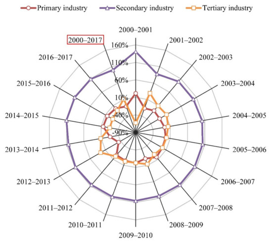 The additive decomposition effect of the industrial structure was 0.12 × 108 t (Figure 4), and the cumulative contribution rate was 9.68% during 2000–2017. In total, the industrial structure was the second most significant driver after economic output, which was similar to the results provided by Zhang et al. [53], who illustrated that there existed some promoting effect of industrial structure on CO2 emissions increase. The effect of industrial structure failed to mitigate the CO2 emissions growth. The primary reason was that the driving effect of the secondary industry accounted for the largest proportion in industrial structure, and the proportion was invariably more than 85% from 2000 to 2017 (Figure 6). The secondary industry accounted for 99.96% in the effect of the industrial structure during 2000–2017, followed by the tertiary and the primary industry which accounted for 11.22% and −10.88%, respectively (Figure 6). The driving effect of the secondary industry offsets the mitigation effect of the primary industry for CO2 emissions growth.