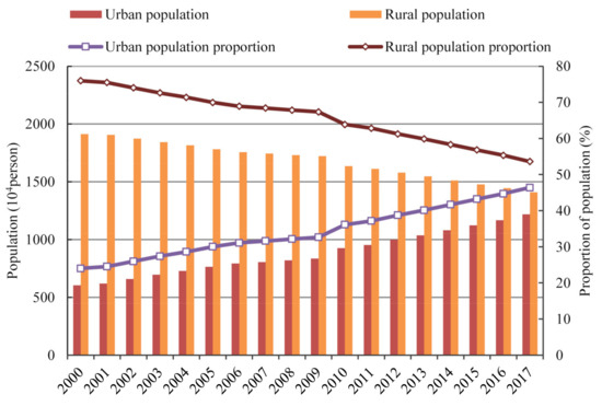 The effect of population scale was a driver of CO2 emissions growth from 2000–2017, with the additive decomposition effect of 0.09 × 108 t and the cumulative contribution rate of 7.85% (Figure 4). The result of this study was in line with the results of an array of previous literature [15,54,56]. The population scale showed a driving effect because Gansu’s urban population presented an upward growth trend. As shown in Figure 7, it was observed that the rural population decreased from 1911.38 × 104 persons in 2000 to 1407.64 × 104 persons in 2017. However, the urban population increased from 603.93 × 104 persons in 2000 to 1218.07 × 104 persons in 2017, and the proportion of urban population increased by 22.83% during 2000–2017. With the rise of urban population, the level of urbanization has been constantly improved and the process of urbanization has been also accelerated. These promoted the development of industry, transportation, construction, and service industry. Moreover, the construction of urban infrastructure has been accelerated expansion. These led to the continuous extension of energy demand, which in turn brought about the increase of energy consumption, and then resulted in the growth of CO2 emissions. In addition, the secondary industry played the most important role in the effect of population scale with the cumulative contribution value of 889.44 × 104 t during 2000–2017, followed by the tertiary industry and then by the primary industry with the cumulative contribution values of 51.1 × 104 t and 6.21 × 104 t, respectively (Figure 5a).