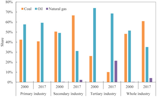 The cumulative contribution values of energy structure in the primary industry and the secondary industry on the CO2 emissions were 3.92 × 104 t and 462.33 × 104 t in 2000–2017 (Figure 5a). The above two sub-industries showed driving effects because the energy consumption structure within the industry was relatively unreasonable. As shown in Figure 8, it was observed that the shares of coal and oil in the primary industry were 40.74% and 59.26% in 2017. At the same time, the share of coal in the secondary industry presented an upward trend and increased from 50.47% in 2000 to 66.71% in 2017 (Figure 8). It ranked first, followed by oil and natural gas. Both the primary and the secondary industry have maintained the high-carbon energy consumption structure dominated by coal and oil. In addition, the cumulative contribution value of energy structure in the tertiary industry was −97.12 × 104 t during 2000–2017 (Figure 5a). The tertiary industry showed a mitigation effect because the energy consumption structure was relatively reasonable. To be specific, the share of coal presented a downward trend and declined from 26.05% in 2000 to 10.10% in 2017, whereas the share of natural gas increased from zero to 21.39% between 2000 and 2017 in the tertiary industry (Figure 8). Therefore, the adjustment of energy consumption structure cannot be ignored in Gansu, especially in the primary industry and the secondary industry.